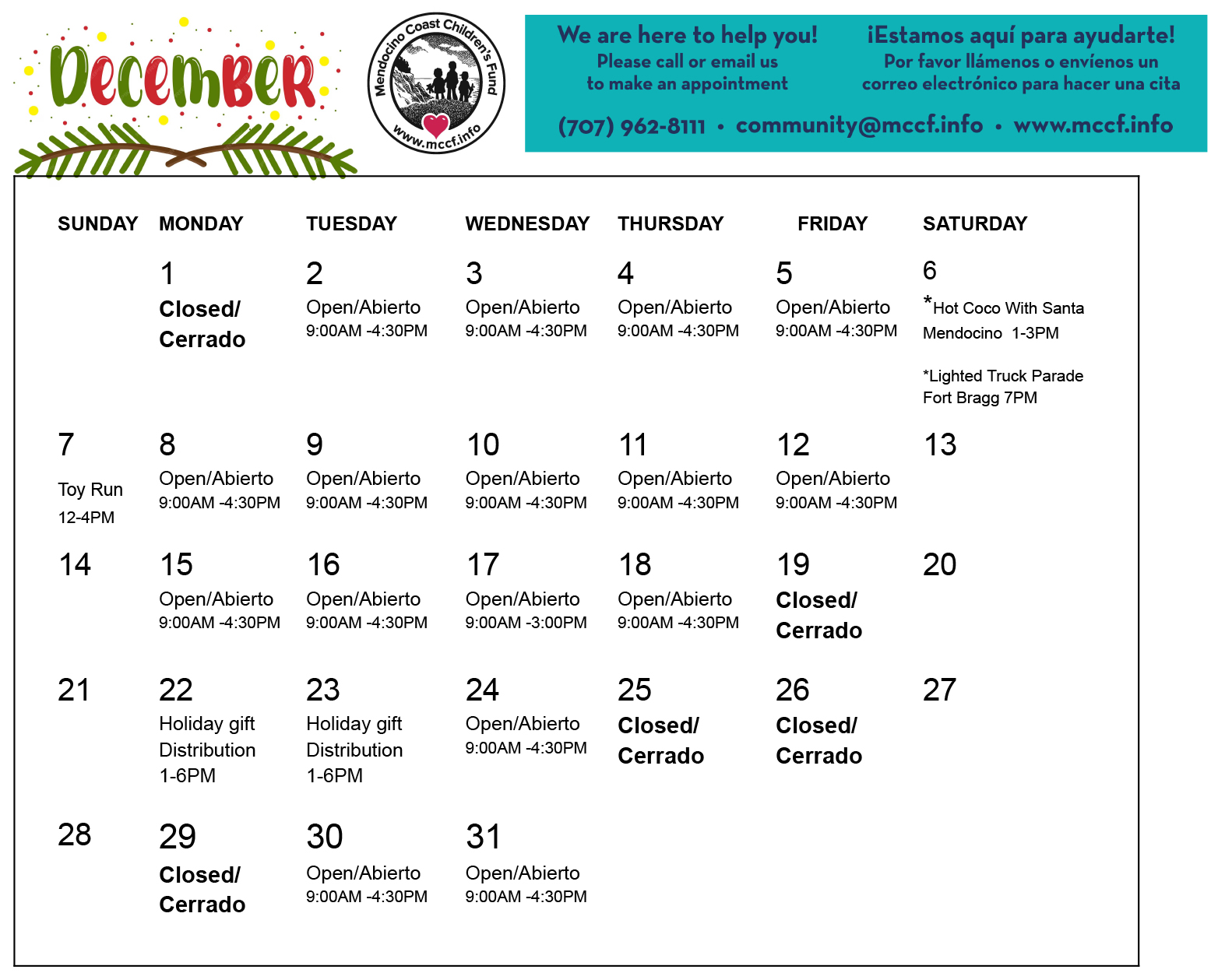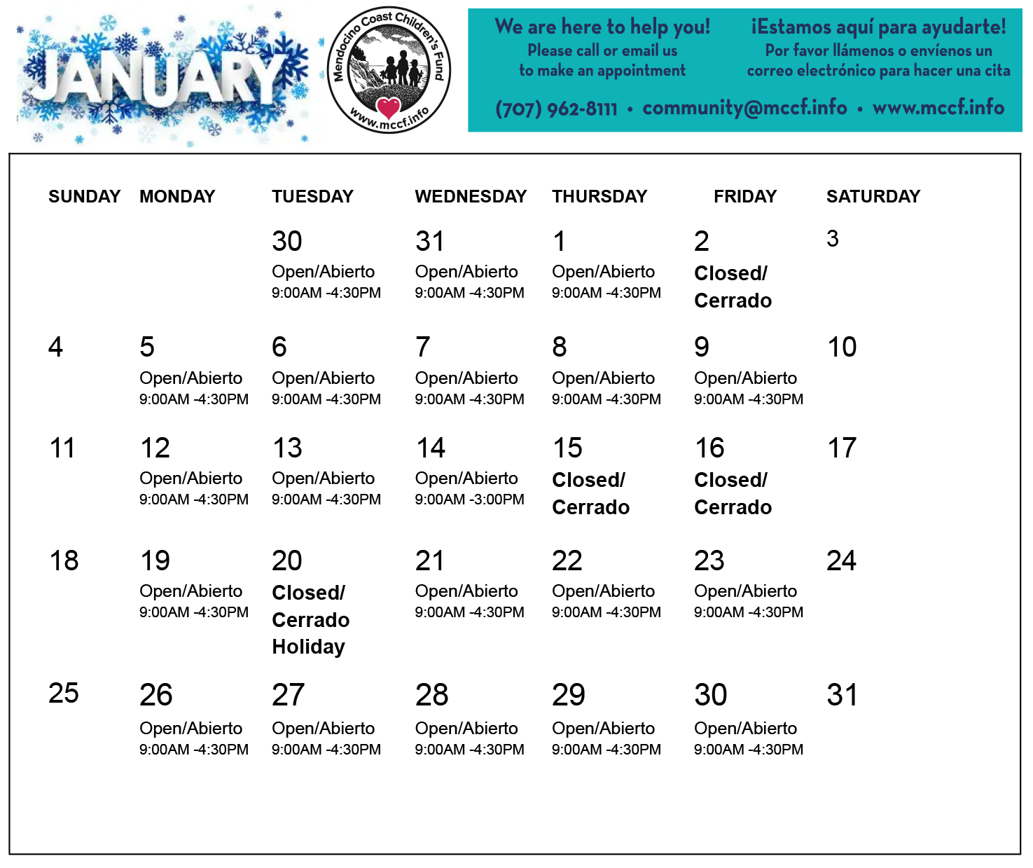 We’re here to help Mendocino coast kids get access to the resources they need to thrive. Click these links for either an English or Spanish version of the MCCF Community Resource List for quick access to locations and phone numbers of crucial services.